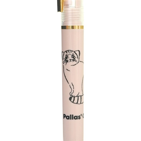 パステルピンクの本体にこちらを見つめるマヌルネコがワンポイント!0.5㎜ボールのインクは黒色、ノック式で書き味もなめらかです。