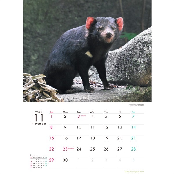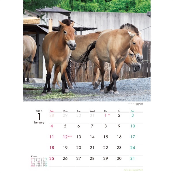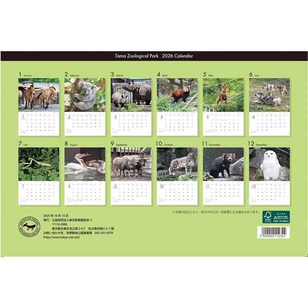 掲載内容:1月モウコノウマ 2月コアラ 3月インドサイ 4月レッサーパンダ 5月ボルネオオランウータン 6月タイリクオオカミ 7月オオカマキリ 8月モモイロペリカン 9月スイギュウ 10月ユキヒョウ 11月タスマニアデビル 12月シロフクロウ