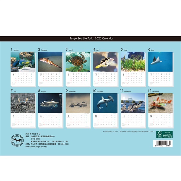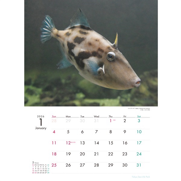 掲載内容:1月ホースシューレザージャケット 2月スポテッドラットフィッシュ 3月アオウミガメ 4月ノコギリハギ 5月ヘコアユ 6月ウシバナトビエイ 7月チゴガニ 8月クロマグロ 9月トビハゼ 10月アカシュモクザメ 11月ミナミイワトビペンギン 12月ホウボウ